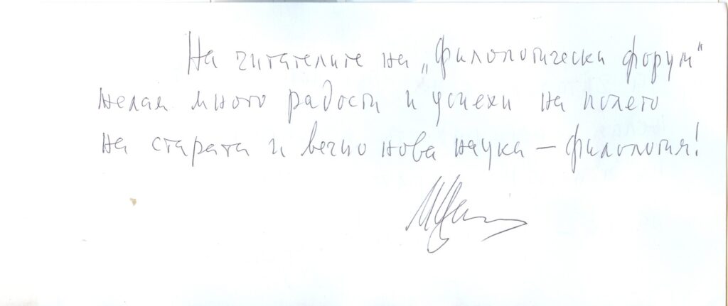 Преди всичко искам да кажа, че много се радвам за основаването на това списание, защото има място и има нужда от него. Харесвам и самото название „Филологически форум“.